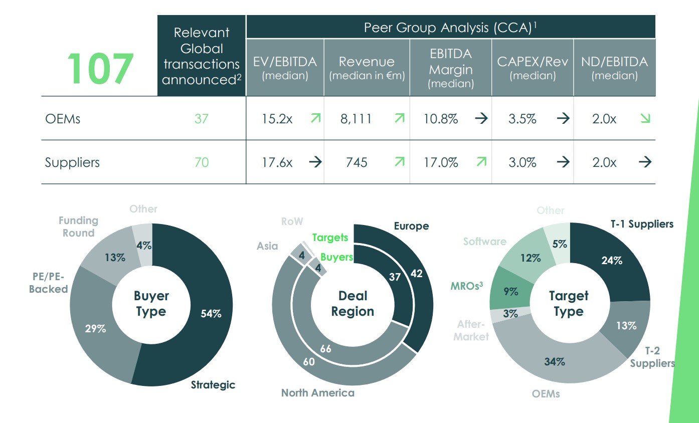 Die Bewertungen im Sektor spiegeln die robuste Nachfrage wider. Bei OEMs lag das EV/EBITDA-Multiple im Median bei 15,2x, bei Zulieferern sogar bei 17,6x. Die EBITDA-Margen zeigten sich stabil mit durchschnittlich 10,8 % bei OEMs und 17,0 % bei Zulieferern. Der Verschuldungsgrad (ND/EBITDA) bewegte sich im Median bei 2,0x und damit auf solidem Niveau. Bei ausgewählten Deals lag das Multiple mit durchschnittlich 14,5x EV/EBITDA auf hohem Niveau. Bemerkenswert ist zudem die hohe Investitionsquote: Viele Player reinvestieren zwischen 3 % und 5 % ihres Umsatzes in CAPEX, um Kapazitäten auszubauen und Reshoring-Strategien umzusetzen.