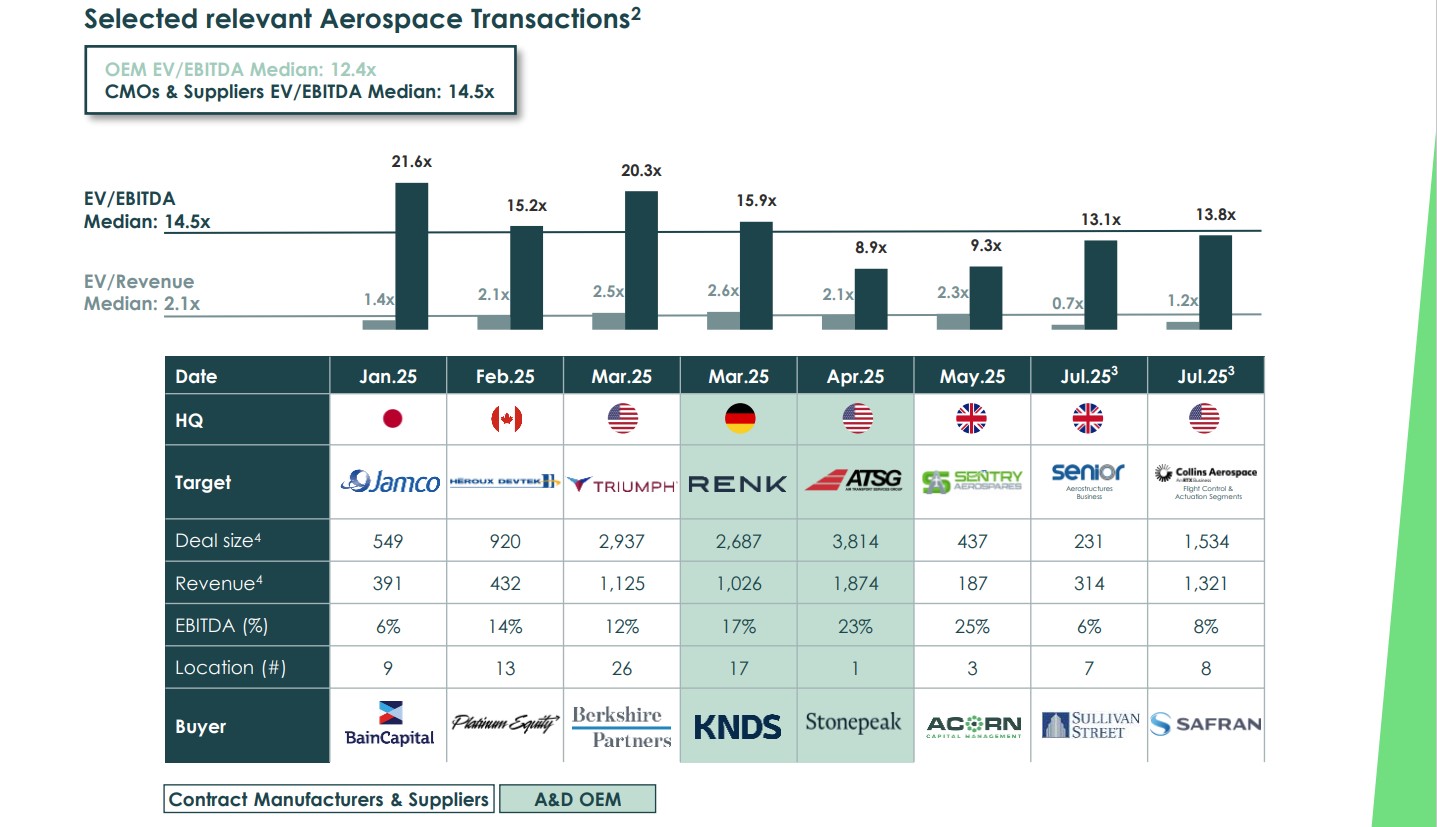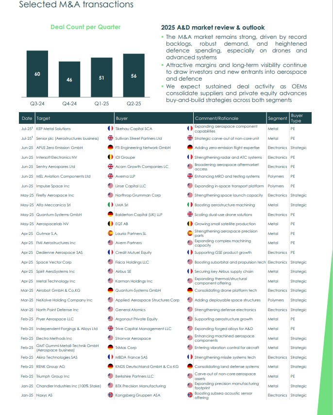 Das erste Halbjahr 2025 war von intensiver Fusions- und Übernahmetätigkeit geprägt. Airframer wie Airbus oder Boeing, aber auch Tier-1-Zulieferer, nutzen Akquisitionen, um Kompetenzen und Lieferketten zu sichern. Besonders gefragt sind Unternehmen mit spezialisierter Technologie, geschütztem geistigen Eigentum und zertifizierten Produktionsprozessen. Insgesamt wurden bis Mitte 2025 weltweit 107 Transaktionen angekündigt. Ein Großteil dieser Deals entfiel auf Zulieferer, die rund ein Drittel aller Übernahmen ausmachten. Flugzeughersteller trugen rund 13 % bei, während der Aftermarket- und MRO-Bereich mit etwa zwölf % vertreten war. Auf Käuferseite dominierten mit 54 % strategische Investoren, gefolgt von Private-Equity-Fonds, die knapp ein Drittel der Transaktionen verantworteten. Private Equity verfolgt zunehmend Buy-and-Build-Strategien. Auffällig ist zudem, dass Carve-outs – also die Abspaltung von Nicht-Kerngeschäften – eine zentrale Rolle spielen. Beispiele sind der Verkauf von Spirit AeroSystems-Teilen an Airbus oder die Übernahme des Aerostructures-Geschäfts von Senior plc durch einen Finanzinvestor.