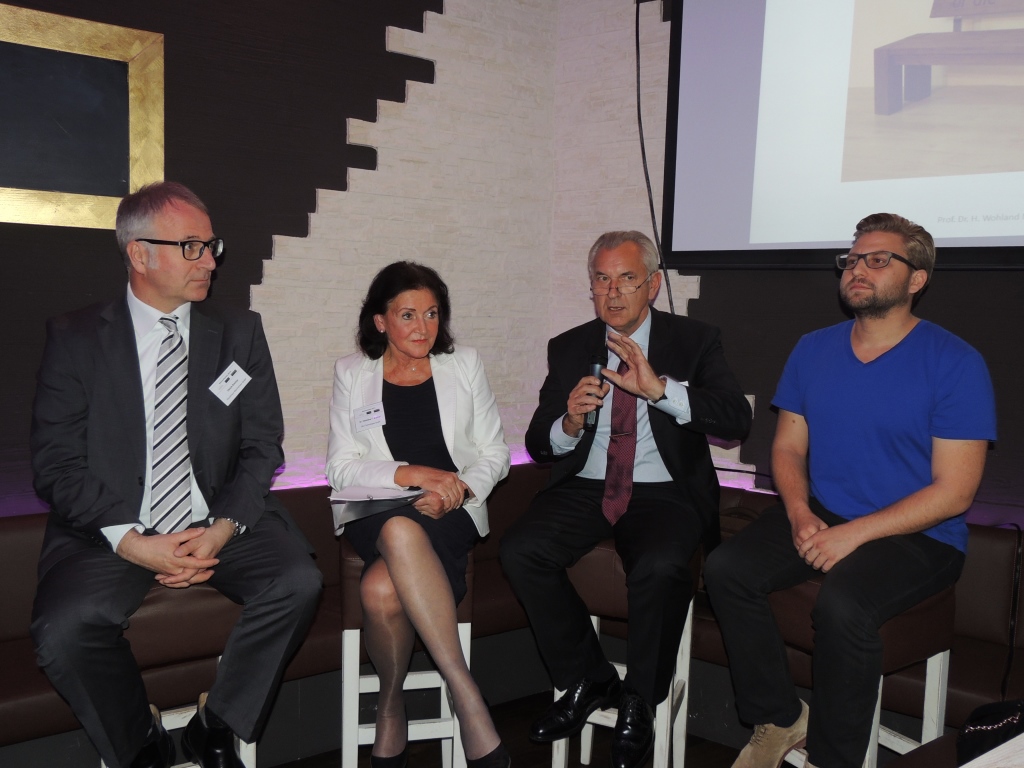Dem Thema „kreative Zerstörung als Schlüssel zum Erfolg“ widmete sich die anschließende Podiumsdiskussion mit der Serial Entrepreneurin Dr. Christine F. Kreiner, dem Ex-Manager und heutigem Management-Berater Prof. Dr. Helmut Wohland, dem Geschäftsführer des Druckhauses Mainfranken, Ulrich Stetter, und Philipp Roesch-Schlanderer, Gründer des Kraftgeräte-Herstellers eGym. Schnell gingen die Diskutanten allerdings dazu über, sich zur eigenen Unternehmensphilosphie zu erklären. Kreiner beschrieb sich selbst als eine große Anhängerin des Business-Plans: „Wenn Sie drauflos investieren, sind Sie schon tot.“ Stetter berichtete dagegen seinerzeit auf einen Businessplan verzichtet zu haben, um schnell am Markt teilnehmen zu können. Roesch-Landerer bekundete, dass sein Geschäftsmodell nicht unbedingt disruptiv sei, sondern etwas Bestehendes verbessert habe. Die Geräte von eGym ermöglichen dem Anwender dank Web-Anbindung eine individuelle Kontrolle seines Trainings und die ortsunabhängige Abrufbarkeit seiner Trainingsdaten. Entsprechend prognostizierte er allgemein eine „Wertschöpfung im Digitalen“. Wohland warb dafür, sich bei jedem Angebot über das zukünftige Substitutionsprodukt Gedanken zu machen: „Warum gibt es wohl Amazon Kindle?“