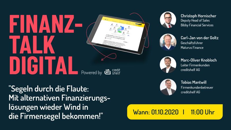 Erfahren Sie in diesem Finanz-Talk Digital, wie Sie alternative Finanzierungslösungen für Ihr Unternehmen – auch in Zeiten von Covid-19 – nutzen und von welchen Vorteilen Sie somit profitieren können. Ob Antragsprozesse, Schnelligkeit, Individualität oder Voraussetzungen, es werden keine Fragen offen gelassen!