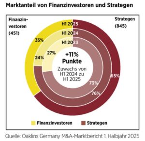 In verschiedenen Ausgestaltungen nehmen Finanzinvestoren am Marktgeschehen teil und waren im ersten Halbjahr 2025 für 35 % aller M&A-Transaktionen mit deutscher Beteiligung verantwortlich. Wenngleich sich der Anteil von mehr als einem Drittel an den Transaktionen daraus speist, dass sich die absolute Anzahl an Transaktionen mit deutscher Beteiligung verringert hat, zeigt sich dennoch, dass sie einen bedeutenden Anteil an derzeitigen Nachfolgelösungen ausmachen.