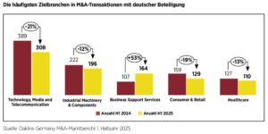 Finanzinvestoren sind ein fester Bestandteil der M&A-Landschaft und treten als Käufer und Verkäufer regelmäßig in Erscheinung. Anhand der Übernahmeaktivitäten mit deutscher Beteiligung im ersten Halbjahr 2025 lässt sich feststellen, dass diese Käufergruppe insgesamt an rund 35 % aller Transaktionen beteiligt war – das sind elf Prozentpunkte mehr als im Vorjahreszeitraum. Besonders aktiv sind Finanzinvestoren aktuell in konjunkturunabhängigen und Asset-Light-Branchen wie etwa dem Dienstleistungssektor, in denen sie konsequent ihre Buy-and-Build-Strategien verfolgen.