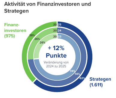 Parallel verschiebt sich die Käuferstruktur: Finanzinvestoren steigern ihre Aktivität deutlich auf 975 Transaktionen (+36 %) und erreichen damit einen Marktanteil von 38% (höchster Wert seit 2022). Treiber sind u. a. gesunkene Finanzierungskosten und hoher Investitionsdruck durch verfügbares Fondsvolumen.