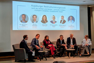 Im Anschluss an den Vortrag folgte eine hochkarätig besetzte Paneldiskussion. Die Moderation übernahmen Eva Ringelspacher (Wieselhuber & Partner) und Dr. Maximilian Hüttel (Sonntag & Partner). Zu den Teilnehmern gehörte Andreas Stocker von der Stadtsparkasse Augsburg. Er leitet dort die Abteilung für Consulting und gilt als Sanierungsspezialist. Stocker beschrieb ein deutliches Warnsignal für eine beginnende Schieflage. Er kritisierte den mangelnden Fokus auf Innovationen im Vorfeld einer Krise. Oft würden Fehler lange vor dem eigentlichen Zusammenbruch gemacht. Ein großes Problem stellt für ihn die mangelnde Transparenz in vielen Unternehmen dar. Er berichtete von Gesprächen, in denen lediglich veraltete Abschlüsse vorlägen. Aktuelle Daten für das vergangene Jahr fehlten häufig komplett. Trotzdem sehe sich die Bank als Partner für neue Konzepte.