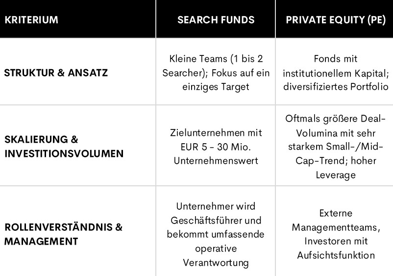Oberflächlich sehen beide Modelle nach „Buy-out“ aus, kulturell und operativ unterscheiden sie sich aber deutlich. Search Funds investieren meist in ein einziges Unternehmen, mit kleinem Team und maximaler operativer Nähe. PE-Fonds investieren diversifiziert über mehrere Beteiligungen, häufig mit stärkerem Leverage und externer Managementführung.