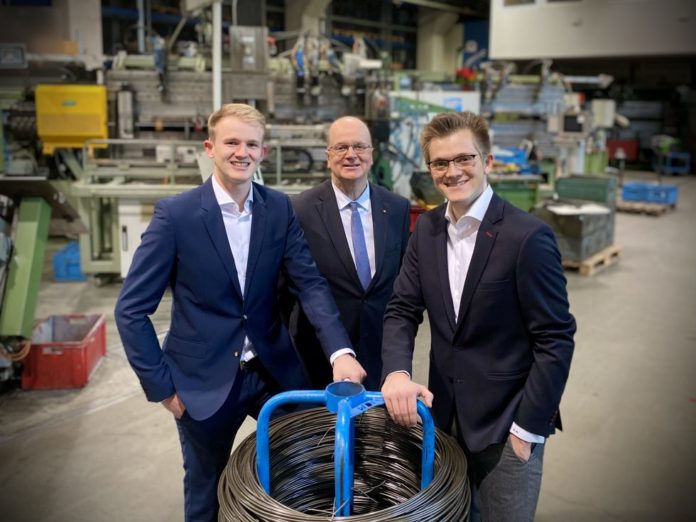 Das 1888 gegründete Lüdenscheider Traditionsunternehmen Kämper hat zum Jahresbeginn die Geschäftsführung gewechselt. Wie das Unternehmen mitteilte, hat Yanik Müchler (links im Bild) am 1. Januar 2021 die kaufmännische Geschäftsführung von seinem Vater Thomas Müchler (Bildmitte) übernommen. Im Sommer hatte er sein Bachelor-Studium der Betriebswirtschaft in Köln abgeschlossen. Das Masterstudium, das er ab September aufgenommen hat, will er nun nebenbei weitermachen. Sein zwei Jahre älterer Bruder Sven Müchler (rechts im Bild) schließt gerade sein Maschinenbau-Studium ab und wird dann die technische Geschäftsleitung übernehmen. Damit übernimmt die 5. Generation. Thomas Müchler (60) wird dem Unternehmen als Beirat und für den Bereich strategische Entscheidungen verbunden bleiben.